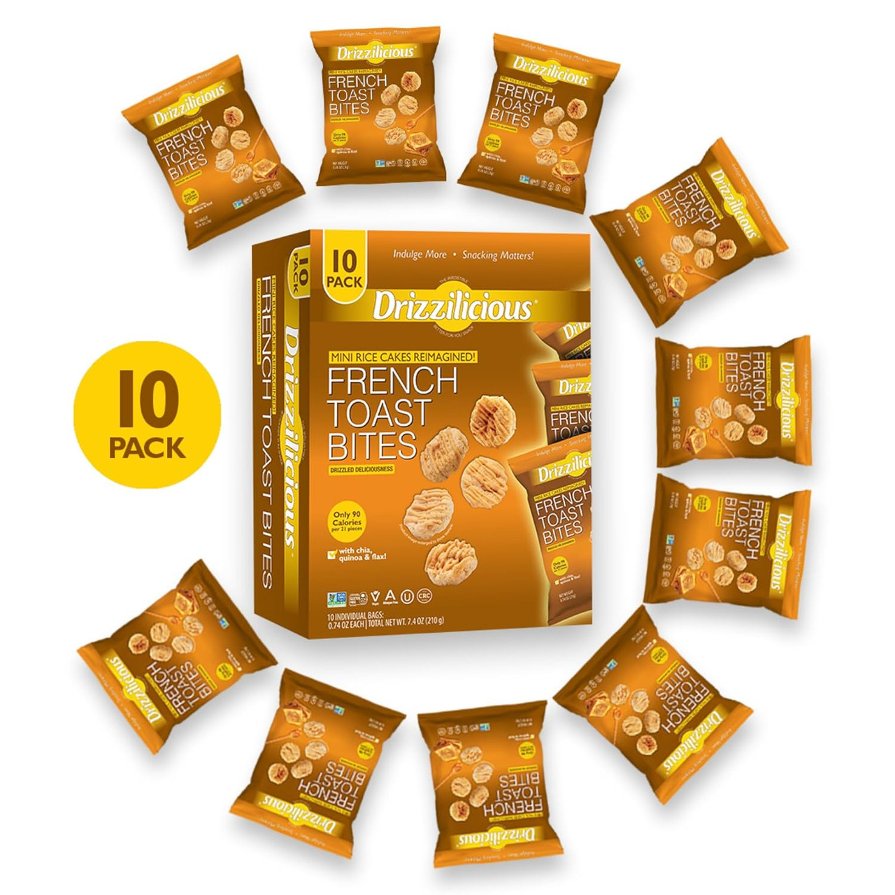 - Drizzilicious French Toast Bites Mini Rice Cakes, Gluten-Free, Vegan, Low Calorie Snacks with Quinoa, Chia and Flax, 0.74 oz, Pack of 10