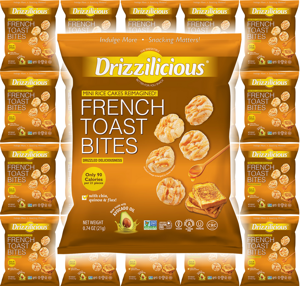 - Drizzilicious French Toast Mini Rice Cakes, 0.74 oz Bags, Gluten-Free, Vegan, with Quinoa, Chia and Flax, 90 Calories (Pack of 20)