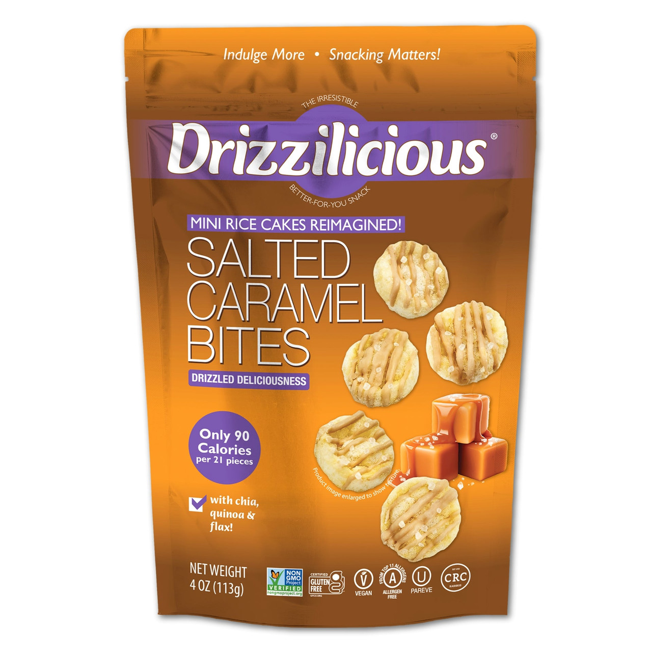 - Drizzilicious Salted Caramel Mini Rice Cakes, 4 oz, Gluten-Free, Vegan, with Quinoa, Chia and Flax, 90 Calories