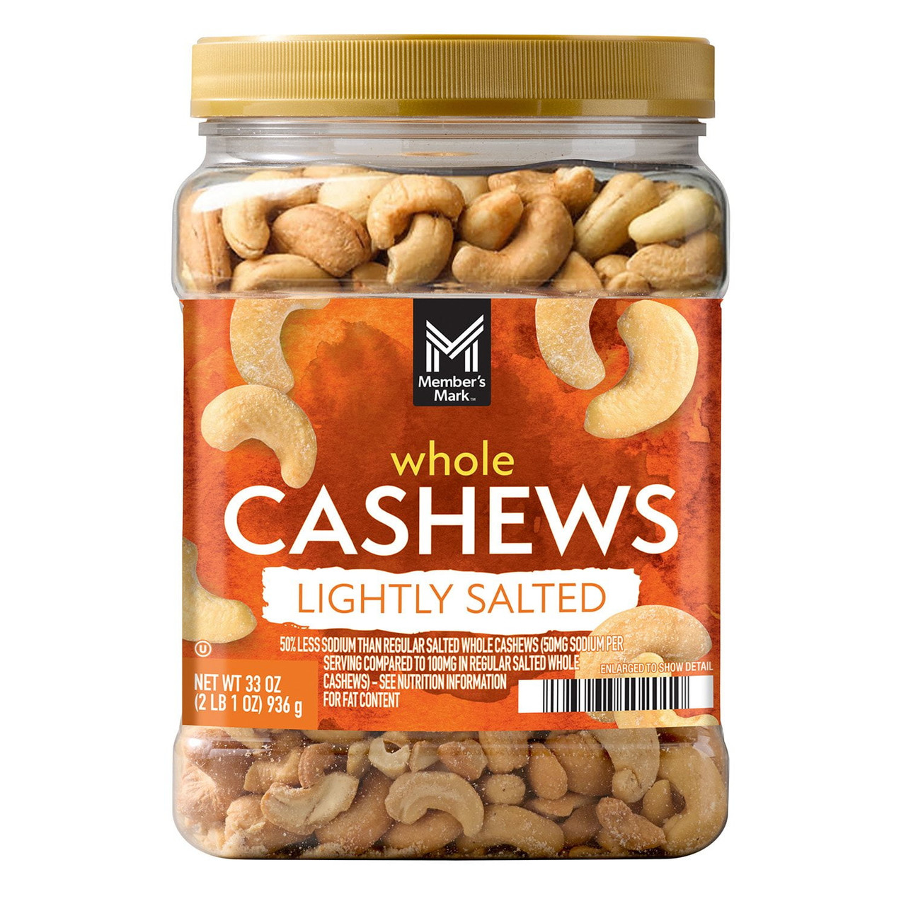 - Member's Mark Lightly Salted Whole Cashews, 33 oz, Roasted with Sea Salt, 50% Less Sodium, Protein Snack